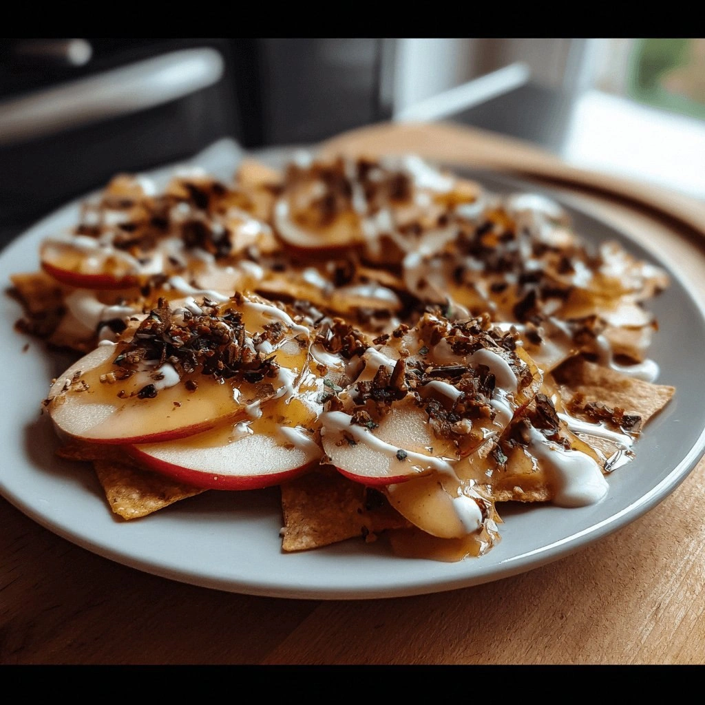 - As soon as the apples are out of the oven, drizzle the warm butter‑honey glaze over them. The glaze will thicken slightly as it cools, forming a silky coating that holds the crispness. Let the nachos sit for a minute to allow the glaze to set, then transfer them to a serving platter. The final presentation should look like a golden mosaic of caramelized apple slices.