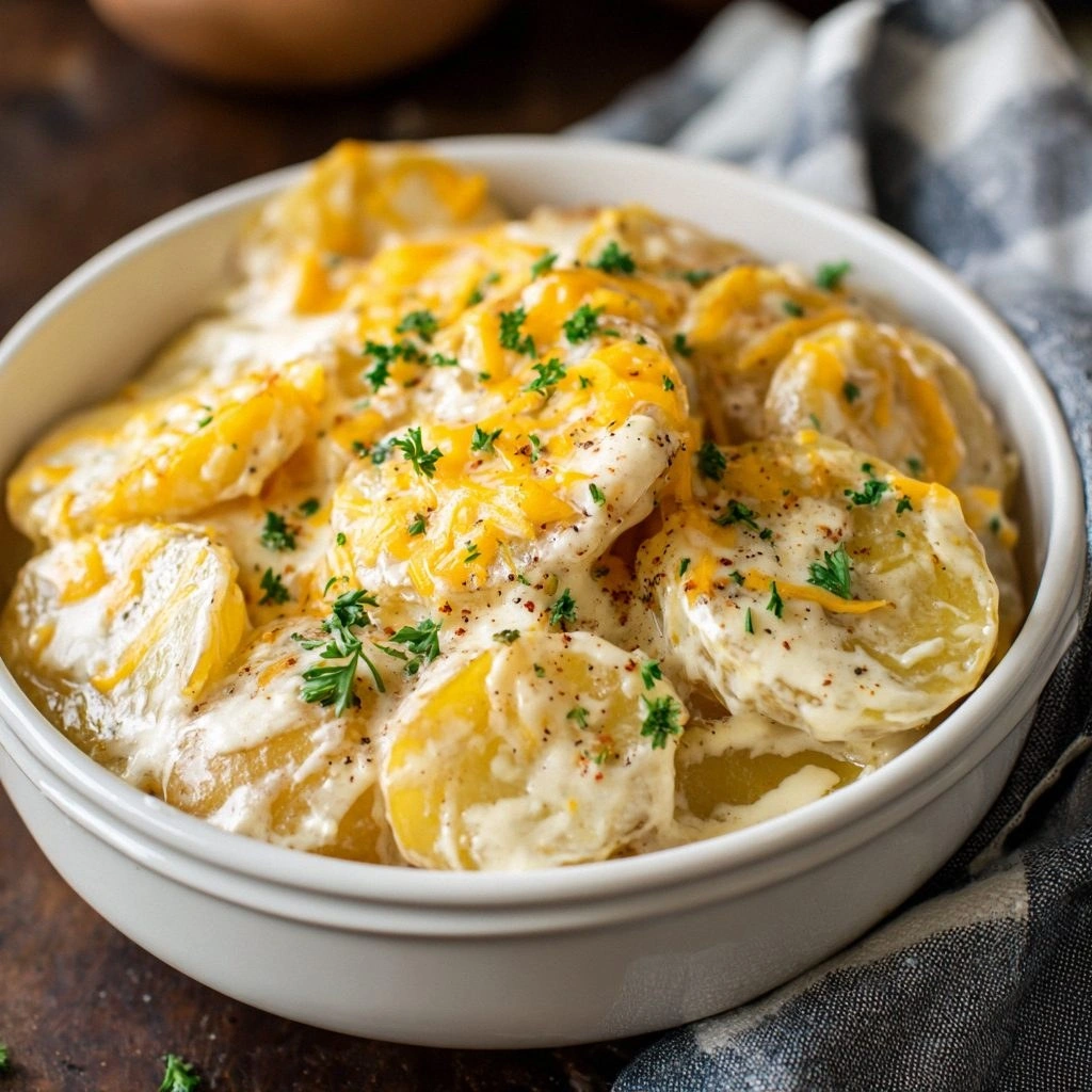 This isn’t your grandma’s casserole or a quick stovetop mash. No, this is a slow‑cooked masterpiece that turns humble russet potatoes into a silky, golden delight. The sauce coats every slice like velvet, and the cheese pulls into ribbons that stretch across the plate like a lazy river. The subtle crunch of the edges—just enough to remind you there’s still texture beneath the cream—shatters like thin ice when you bite. The result? A side that feels like a hug in a bowl, and trust me, I dare you to taste this and not go back for seconds.