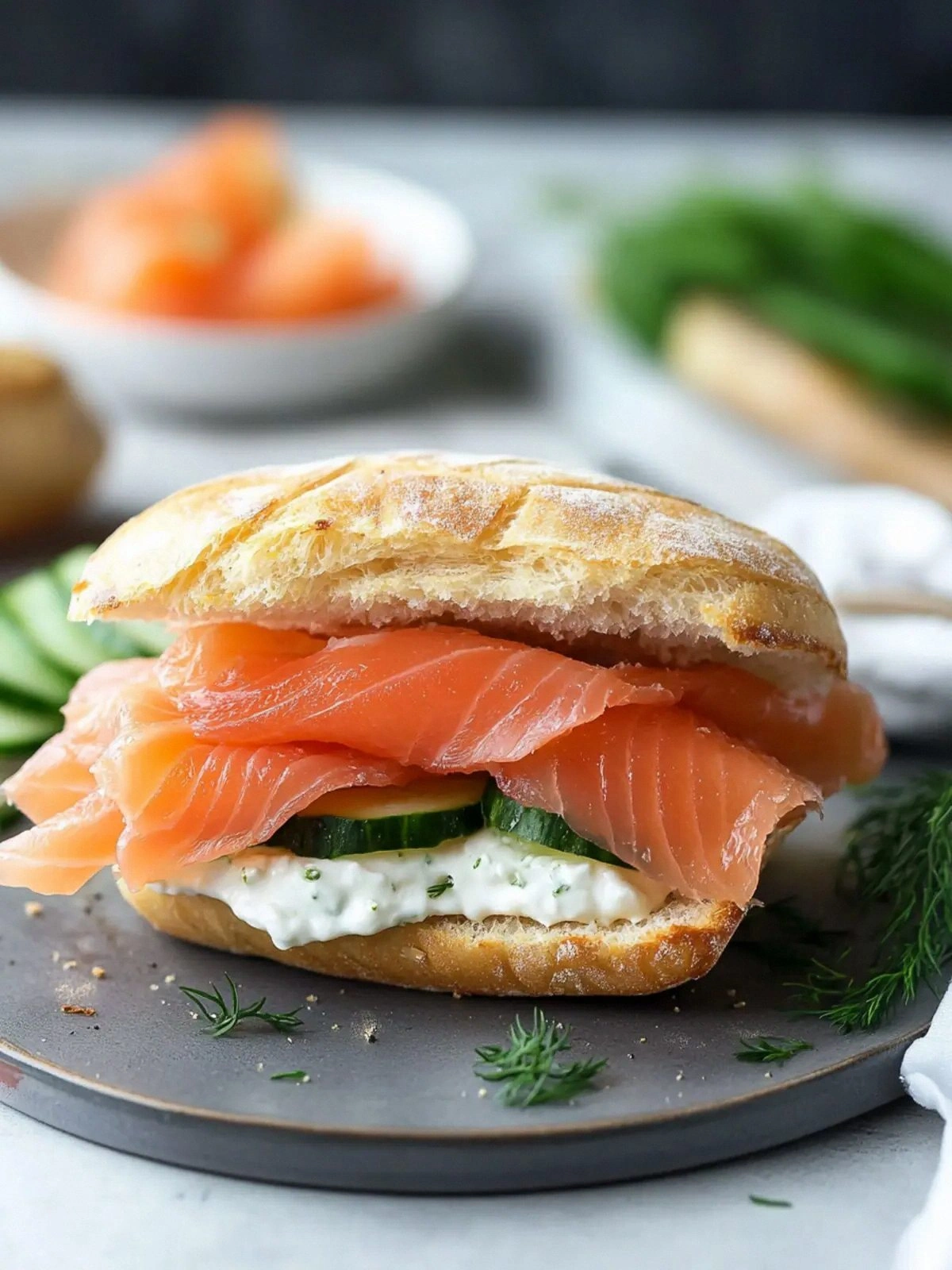 Use a plant-based cream cheese and replace the smoked salmon with marinated tofu or tempeh. The tofu should be lightly seasoned with soy sauce and smoked paprika. The result is a vegan sandwich that still delivers on flavor and texture.
